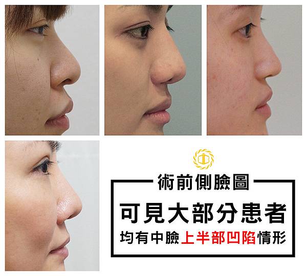 開始進入患者臉型分析,我們先看患者未施作做手術時側臉凹陷程度,很大比例上患者的中臉上段均比下段凹陷。也就是這幾乎是亞洲患者的臉部共同特徵